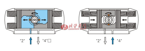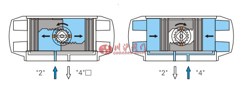 當(dāng)氣源壓力從氣口(2)進(jìn)入氣缸兩活塞之間中腔時(shí),使兩活塞分離向氣缸兩端方向移動(dòng),兩端氣腔的空氣通過(guò)氣口(4)排除, 同時(shí)使兩活塞齒條同步帶動(dòng)輸出軸(齒輪)逆時(shí)針?lè)较蛐D(zhuǎn)。反之氣源壓力從氣口(4)進(jìn)入氣缸兩端氣腔時(shí),使兩活塞向 氣缸中間方向移動(dòng),中間氣腔的空氣通過(guò)氣口(2)排除,同時(shí)使兩活塞齒條同步帶動(dòng)輸出軸(齒輪)順時(shí)針?lè)较蛐D(zhuǎn)。 (如果把活塞相對(duì)反方向安裝,輸出軸變?yōu)榉聪蛐D(zhuǎn),即為雙作用反轉(zhuǎn)型)
